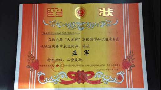 2018年11月10——11日,第六届“大方杯”高校国学知识邀请赛在兰州大学举行,来自武汉大学、四川大学、重庆大学、陕西师范大学、兰州大学、郑州大学、兰州交通大学等24所高校的选手参赛。经过激烈的比拼,兰州大学代表队获得冠军,9499www威尼斯代表队和武汉大学代表队分获亚军和季军。9499www威尼斯历史学专业白占强、医学院护理学专业董宁同学分别获得个人第二名。