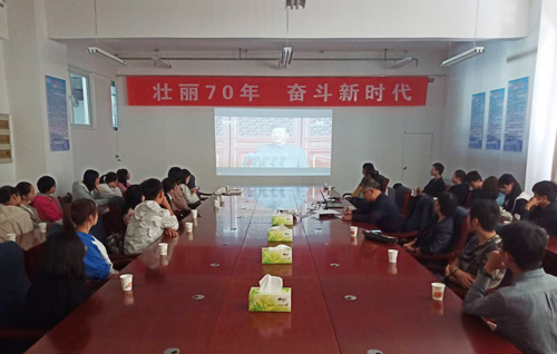 10月1日上午,9499www威尼斯师生50余人在学院会议室集体收看庆祝中华人民共和国成立70周年大会、阅兵式和群众游行实况直播,聆听习近平总书记的重要讲话。