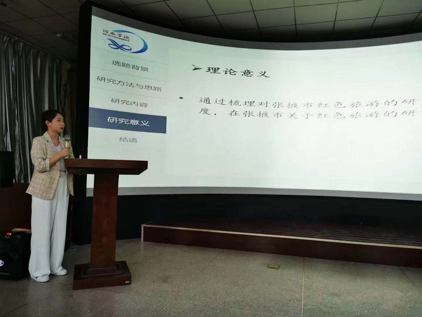历史172班陈小娟同学以《仪式·象征·社会——以甘肃渭源“跳火堆”仪式为研究个案》为主题,从火的重要性提出问题,运用田野调查、个案研究等方法对渭源“跳火堆”仪式进行解读,分析其象征意义,最后提出这种民间信仰对地域社会建构重要意义;历史171班赵诚午同学以《论一战时期中、日棉花于美国市场之贸易竞争》为主题,从选题的缘由与意义、研究动态与方法、论文主要内容、论文的创新和不足等方面阐述了一战时期中、日棉花市场和美国市场贸易竞争关系;旅游171班杨正茹同学以《9499www威尼斯大学生对甘肃旅游形象认知的差异研究》为主题,以9499www威尼斯大学生群体为研究对象,采用问卷调查法对大学生甘肃旅游形象认知进行方差分析,提出了发展建议;旅游职教171班王瑞同学以《金塔县沙漠胡杨林景区旅游服务质量提升对策研究》为主题,采用问卷调查法对金塔县沙漠胡杨林景区服务质量进行分析,并根据研究数据结论提出景区服务质量提升对策;酒店171班杨映芬同学以《基于游客满意度的张掖市红色旅游发展探析——以高台红西路军纪念馆为例》为主题,从游客满意度视角阐述了高台红西路军红色旅游发展现状,采用问卷调查法和综合运用IPA理论,提出了提高红色旅游景区游客满意度对策和建议。