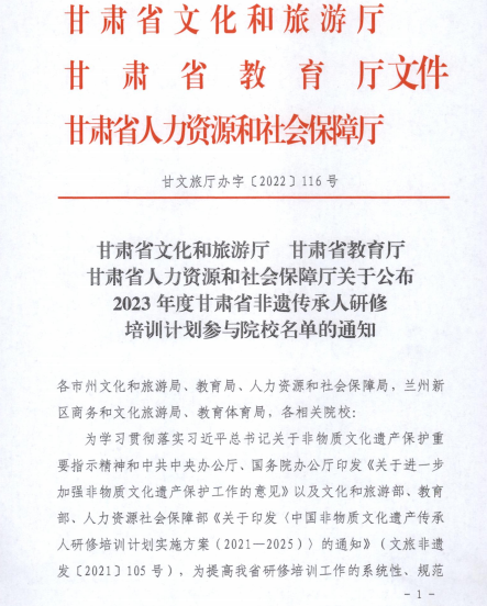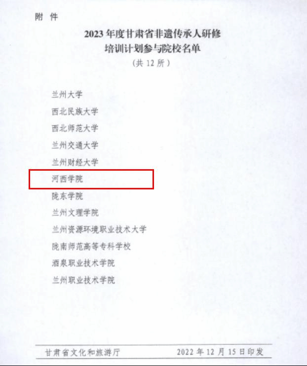 2022年12月15日,甘肃省文化和旅游厅、甘肃省教育厅、甘肃省人力资源和社会保障厅下发《关于公布2023年度甘肃省非遗传承人研修培训计划参与院校名单的通知》,根据通知精神,威尼斯官网入选2023年度甘肃省非遗传承人研修培训计划参与院校。