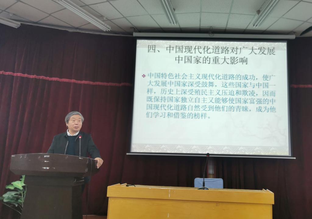李招忠教授的报告以“中国的发展离不开世界,世界的发展也离不开中国”开篇,分别从中国共产党领导的改革开放伟业对世界历史进程的深刻影响、中国共产党领导的改革开放历史伟业对重要国际组织的影响、中国改革开放理论和实践对当代世界社会主义运动的贡献、中国现代化道路对广大发展中国家的重大影响等四个方面,对中国改革开放伟业对世界历史进程的深刻影响作了深入浅出的分析。李招忠在报告中提出,中国的现代化道路是开放的、发展的,既具有中国特色,也符合中国实际;中国提出的人类命运共同体和全球治理理论集中了中华民族优秀传统文化的智慧,又适合解决全球面临的重大问题,是中国给人类贡献的解决世界难题的中国思路,越来越获得世界各国的理解和认同。
