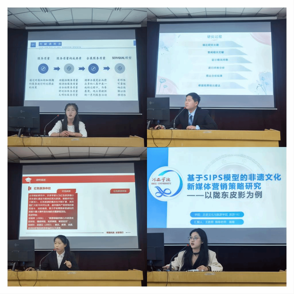 旅游管理、酒店管理、会展经济与管理专业同学刘占兰、刘媛媛、王胜君、张腾4位同学分别以“基于SERVQUAL模型的会展服务质量评价--以兰洽会为例”“红色旅游体验对旅游者幸福感的影响研究--以红军会师旧址为例”“基于SIPS模型的非遗文化新媒体营销策略研究--以陇东皮影为例”和“赤金峡水利风景区漂流项目游客满意度研究”为题进行汇报。与历史学专业不同,4位同学更注重实证研究,在先期问卷调查的基础上,通过数据统计和模型分析得出研究结论。代兰海、林立军两位老师对上述论文分别进行评议,在肯定学生论文撰写的基础上,建议同学们要学习不同的数据模型,用更可靠的数据来支撑研究结论。