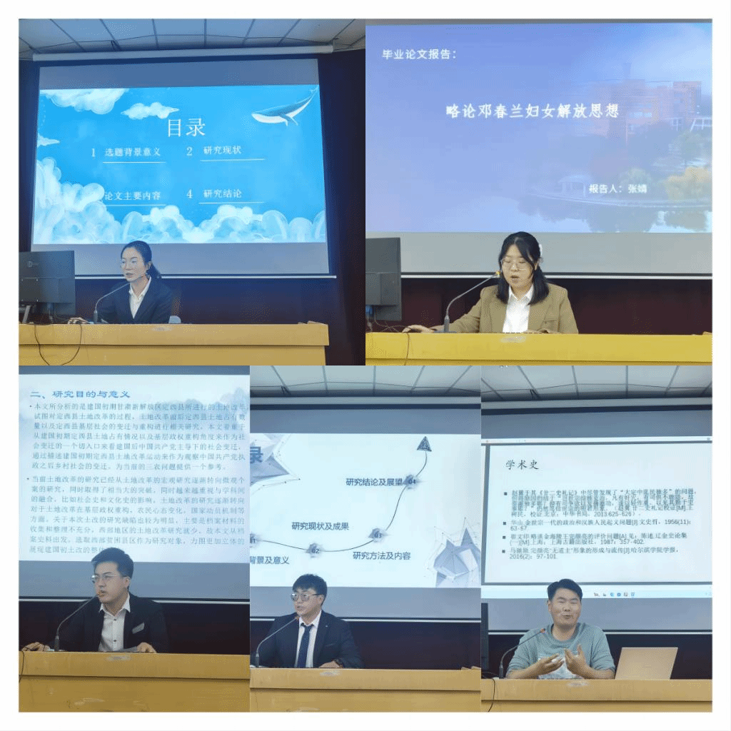 历史学专业鲍春阳、张婧、朱雯、丁浩杰、殷世强等5位同学分别以“建国初期甘肃定西土地改革研究”“略论邓春兰妇女解放思想”“试论明代商人服饰的僭越”“明前期削肃藩初探”和“金遗民对于金世宗明君形象的塑造及其影响”为题,从论文选题背景、研究方法、研究结论等方面做了详细阐述。刘森垚、王红成两位老师对上述论文分别进行评议,肯定了论文优秀之处,并鼓励低年级同学以学年论文的撰写为契机,注重实地考察和研读文献的结合,树立问题意识,带着问题思考,写出高质量的学术论文。