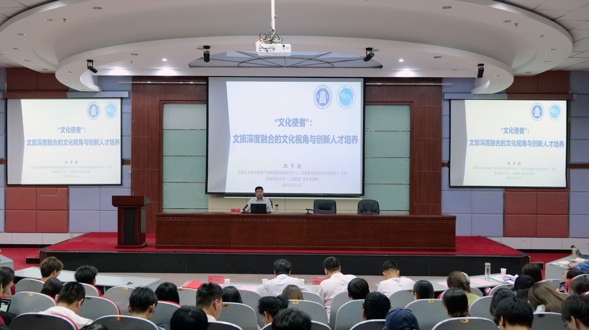 揭牌仪式后,举办了祁连学术月首场报告,把多勋教授以“‘文化使者’:文旅深度融合的文化视角与创新人才培养”为题,围绕“文旅深度融合的时代特征及逻辑”“‘文化使者’:历史、逻辑与实践”作了专题报告,他强调,新时代青年学生要肩负起弘扬中华文化的重大使命,矢志做新时代“文化使者”。