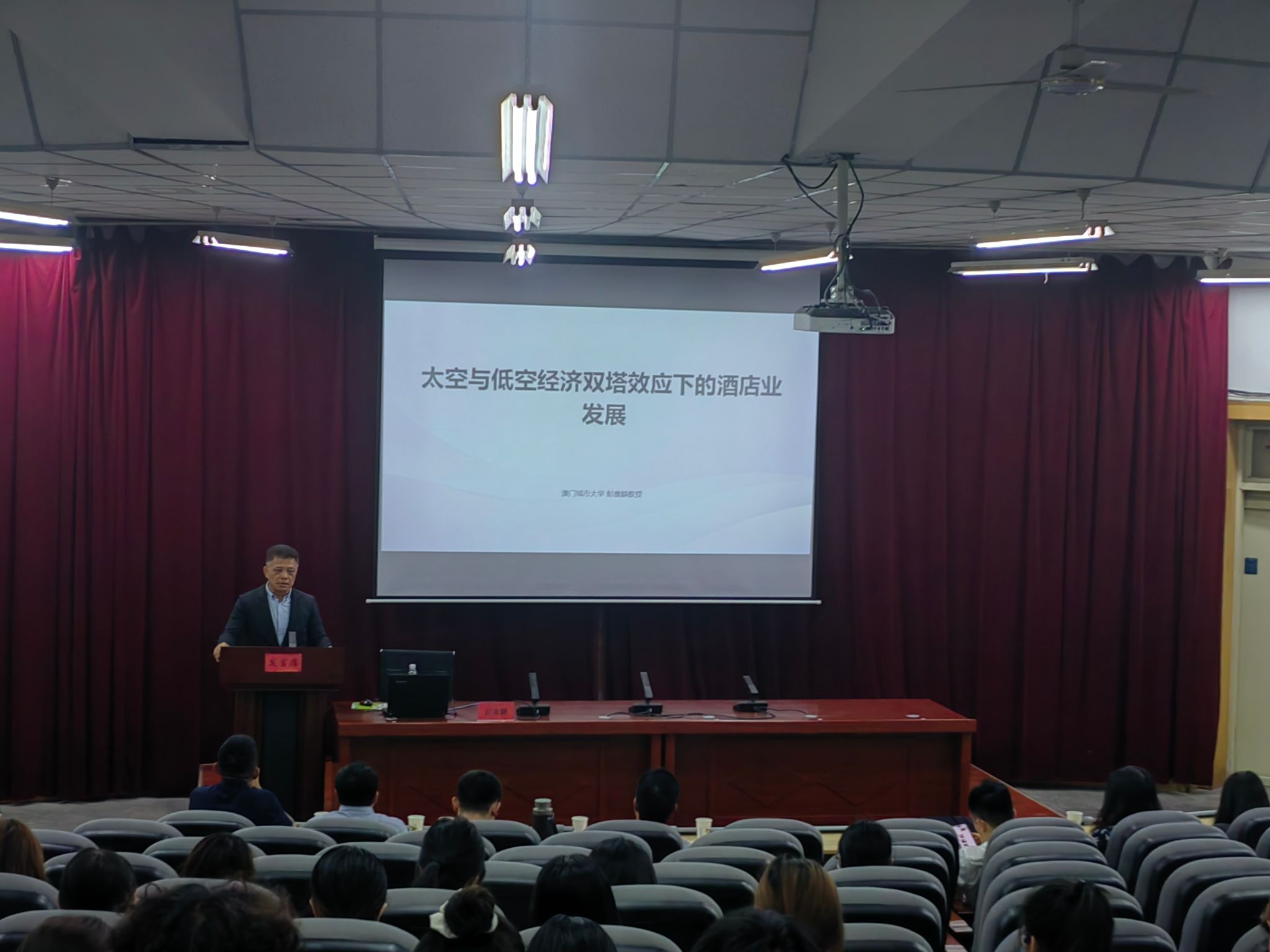 座谈会结束后,澳门城市大学国际旅游与管理学院彭康麟教授和林冰娜博士在学术一厅分别作了题为“太空与低空经济双塔效应下的酒店业发展”和“从视角诱惑到游客参与:美食打卡对游客愉悦的影响机制”的专题讲座,学院200多名师生参加报告会。彭康麟教授介绍太空经济和低空经济概念,在构建双塔效应模型基础上解释了两种经济模式对传统酒店业发展的启示。林冰娜博士以游客美食打卡现象入手,从社会认知驱动因素与顾客参与理论视角,分析了游客美食社交分享的机制,进而揭示了美食体验价值、社交影响力与社交媒体涉入的作用机制。